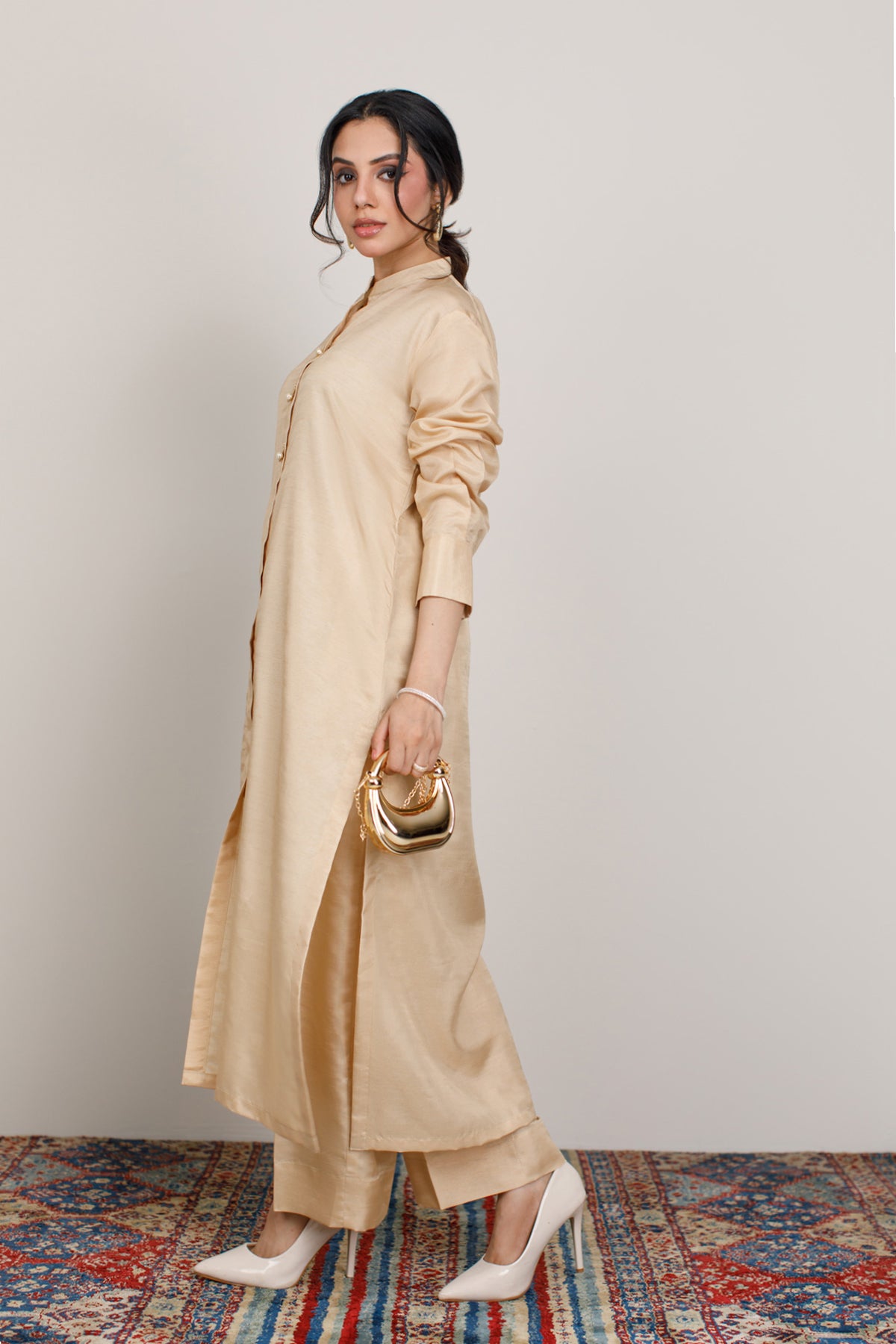 Design Details: Minimal kurta featuring a band collar with front button placket, paired with relaxed straight trousers and a matching chiffon dupatta for a refined, elegant look.